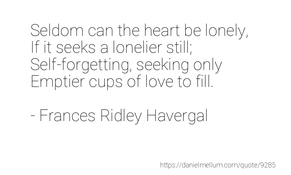 Seldom can the heart be lonely, If it seeks a lonelier still; Self-forgetting, seeking only Emptier cups of love to fill.